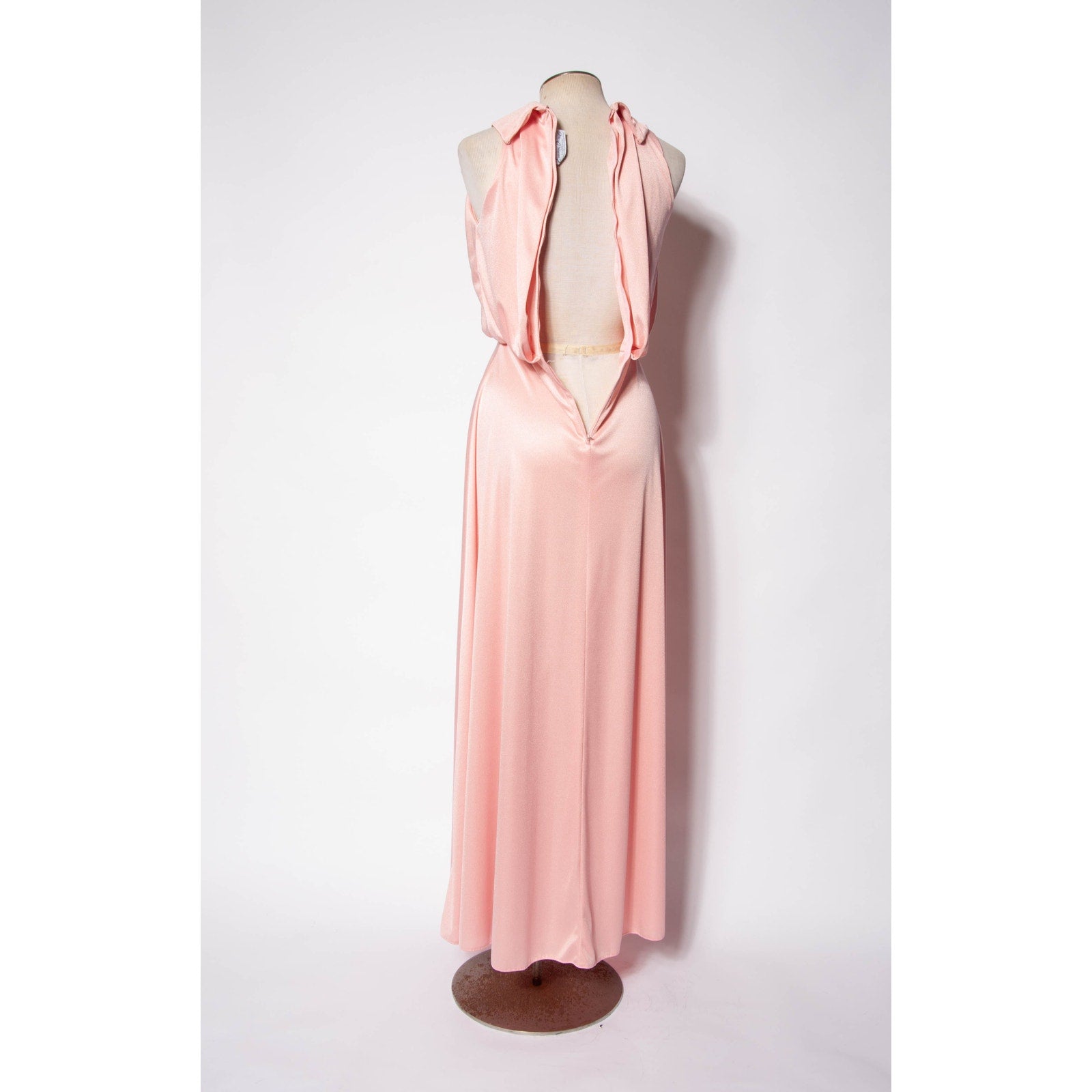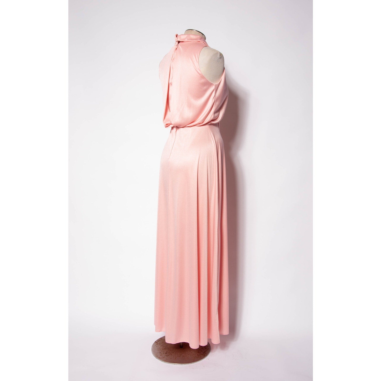 A gorgeous pale pink jersey dress by one of my favorite designers, Emma Domb. Zipper closure down the back and hook and eye closures on the neck. This would make for a gorgeous wedding guest look or bridesmaid gown. I love the neck tie, it can be styled many different ways, as shown above. a