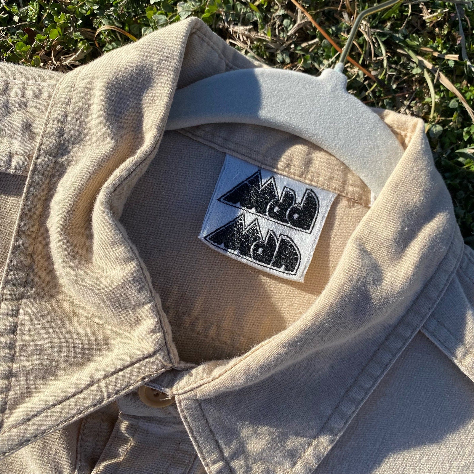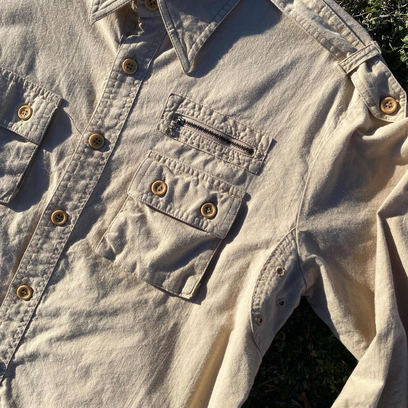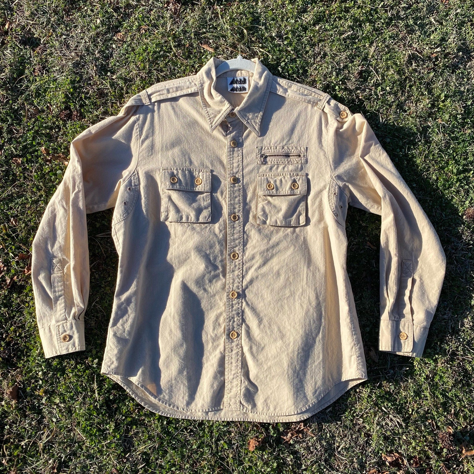This is a fantastic men's vintage cream shirt. Straight from the 70s, just look at that tag! "Mad Man" brand. I love the little zipper detail above one of the two square pockets on the front of the shirt. There is a casual military or aviator vibe to this shirt. Throw this on with your favorite carhartt or dickies trousers or your favorite pair of jeans and you've got a great outfit! This is the perfect, year round closet staple.